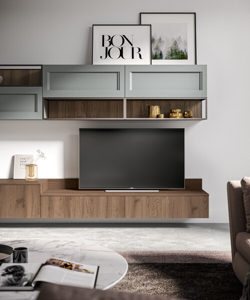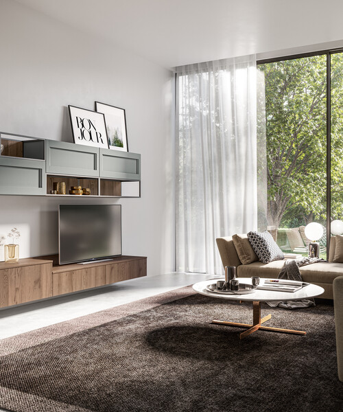 Living Frida — современная гостиная с теплыми деревянными текстурами или лакированными поверхностями.